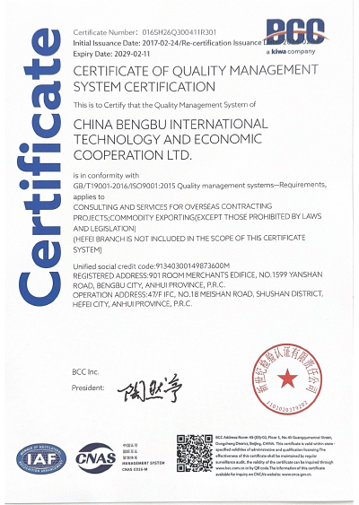 蚌埠市国际经济技术合作有限公司(以下简称 CBITEC)是一家综合性的外贸与工程总承包企业。公司成立于 1987 年,经中国商务部批准设立,注册资本 2 亿元人民币。