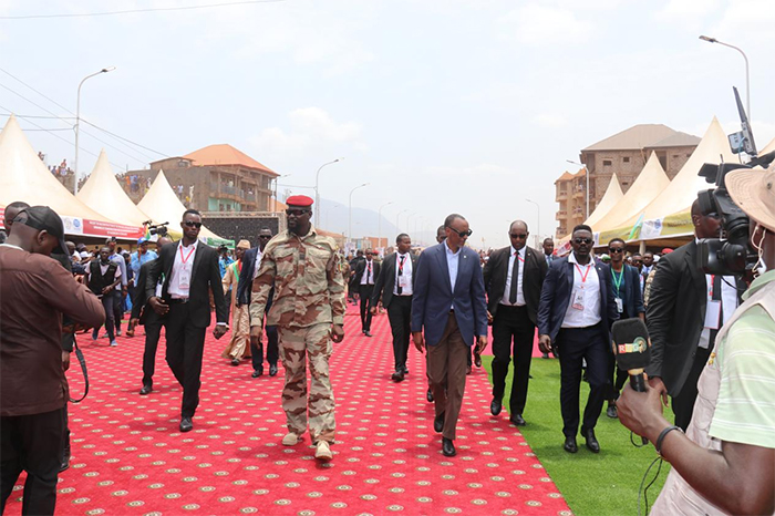 几内亚过渡政府总统马马迪·敦布亚与卢旺达总统保罗·卡加梅进入会场