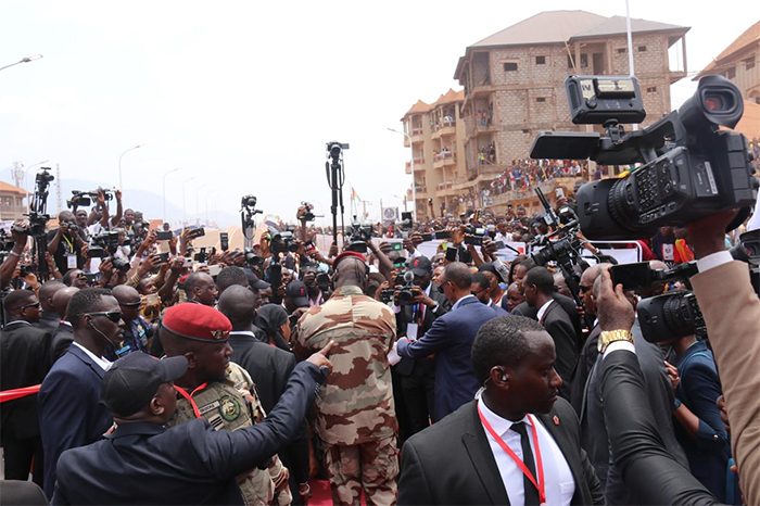 几内亚过渡政府总统马马迪·敦布亚与卢旺达总统保罗·卡加梅共同为立交桥的开通揭幕